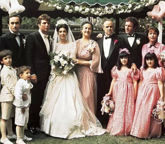 这是电影《TheGodfather》里教父Don Vito Corleone为小女儿Connie Corleone举办的盛大婚礼,尽管这是一个注定失败的婚姻,但传统的西西里风情的婚礼还是为电影带来了一个美丽的开始。镶蕾丝花边的婚纱礼服与经典的欧洲式风格头纱,展现出了不同的风格。