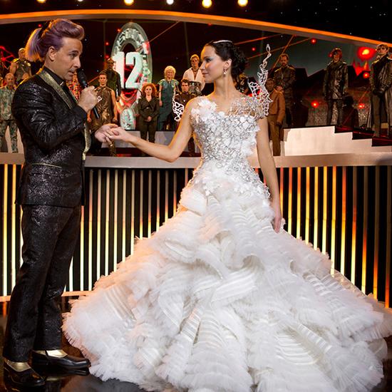 影片中Katniss身穿层叠硬质透明纱深情的挽着President Snow的双手。孰不知,Tex Savario设计此款婚纱时,融入了“范特西”风格,在上半身的银色火焰树上,运用了上千颗施华洛世奇水钻。抛开影片本身,也让观众们饱足了婚纱设计的视觉盛宴!