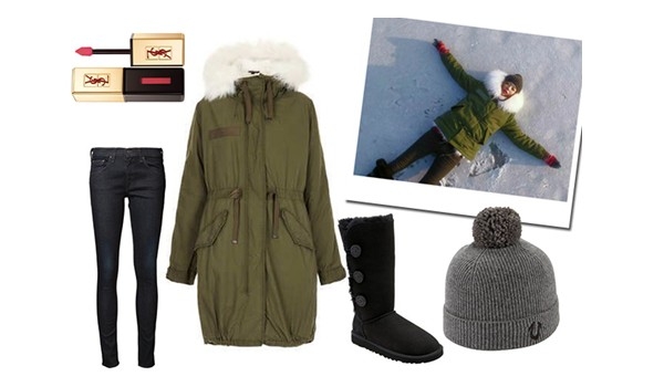 服装造型提供:Topshop军绿色Parka($190) Rag and Bone紧身牛仔裤($195)