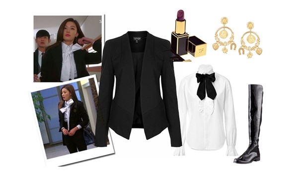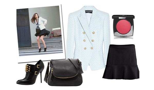 服装造型提供:Ralph Lauren Collection荷叶边衬衫($707) Topshop修身 黑色小西服($90)