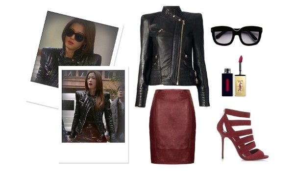服装造型提供:Balmain小羊皮机车夹克($4392) Topshop酒红色皮革铅笔裙($190)