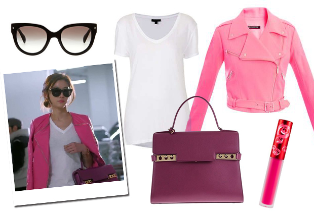 服装造型提供:J Brand粉色机车夹克($1195) Topshop白色打底Tee($20)