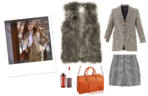 原本乡俗的编织袋格纹今年成为秋冬最火的趋势之一,全智贤饰演的千颂伊作为当红偶像肯定也是深喑潮流的典范。Celine的格纹大衣搭配高腰Emilio Pucci 羊毛混纺半身裙,用宽腰带衔接瞬间拉长比列。颇具新意的实在半身裙里面搭配Christian Louboutin绒面过膝长靴,比打底裤防寒,但是更显质感。