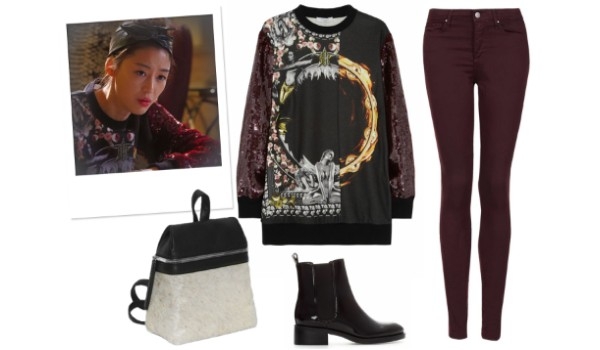 服装造型提供:Givenchy亮片印花卫衣($2395) Topshop酒红色 Skinny牛仔裤($65)