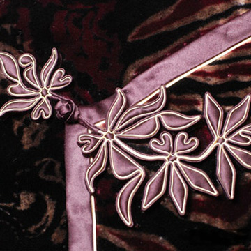 盘扣还是那个盘扣,但缀在不同款式的服装上却表达着不同的服饰语言。立领配盘扣,氤氲着含蓄和典雅;低领配盘扣、洋溢着浪漫和娇俏;短坎长裙中间密密地缀一排平行盘扣,于端丽之中见美感;斜襟短衫缀上几对似花非花的缠丝盘扣,于古雅之中见清纯„„