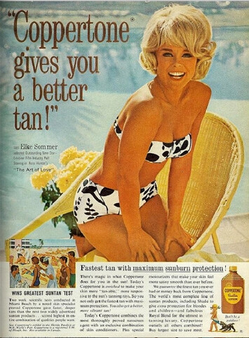 比如1960年代银幕上的性感标志之一、《花花公子》封面女郎Elke Sommer,她拍摄广告的时候就选择穿着黑白的复古泳衣,与金发、浓妆、古铜色肌肤相互对比,塑造出真正的性感。