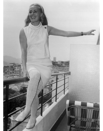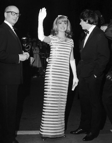 法国影坛常青树凯瑟琳·德纳芙 (Catherine Deneuve)在1966年的戛纳电影节上,身着一件优雅的条纹长裙与观众亲切地打招呼。