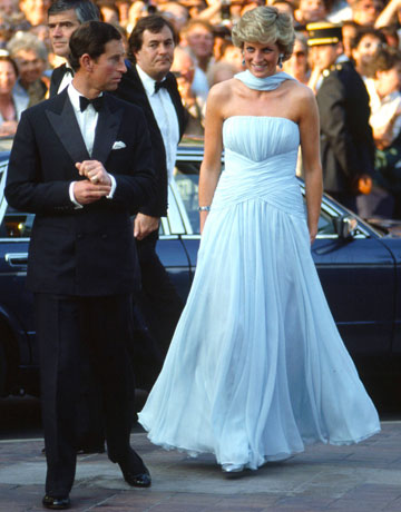 1987年的戛纳电影节,皇室成员也来到现场,戴安娜王妃身着一件Catherine Walker抹胸长裙缓缓向红毯走去。
