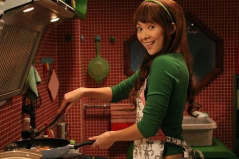 时尚点评:温馨的居家场景,随意的一件修身T恤外套着一件可爱的围裙,但是不要太小看我们的服装工作人员咯,仔细看章子怡的头上戴了一个细细的发箍,与服装同色系的发箍除了起到上下呼应的作用还为她增添了可爱气息。
