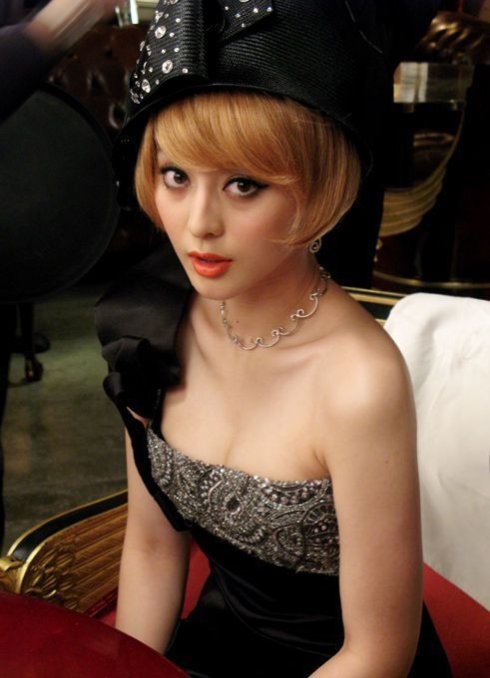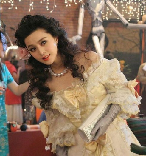 时尚点评:范冰冰很古典欧式的造型,非常的富贵华美,层层叠叠的蕾丝与荷叶边,可以把不完美的体形改装得非常完美,整体宛如欧洲贵妇,发角的一朵玫瑰,虽然有些俗气,但也正是电影里角色看点之一。