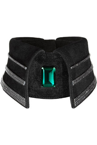 这件独一无二的金属搭配的皮具作品上不仅饰有40克拉的黑钻,还在中央的镀铑的银饰中镶嵌了一枚22.33克拉的祖母绿宝石,售价29000英镑。