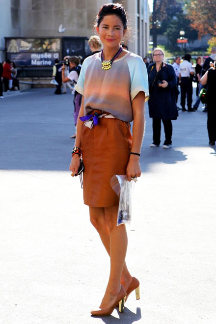 如果是一件纯白T恤,来一条长丝巾代替项链吧,选一条轻盈、薄透、浅色的降低闷热感,这种休闲随意的造型,带有自然型、少年型、时尚型成分的人都可以尝试。