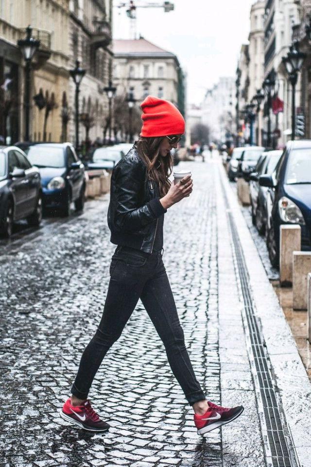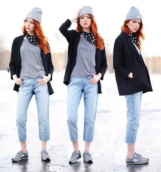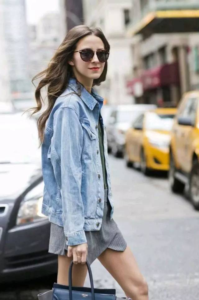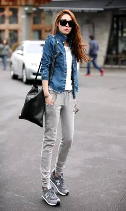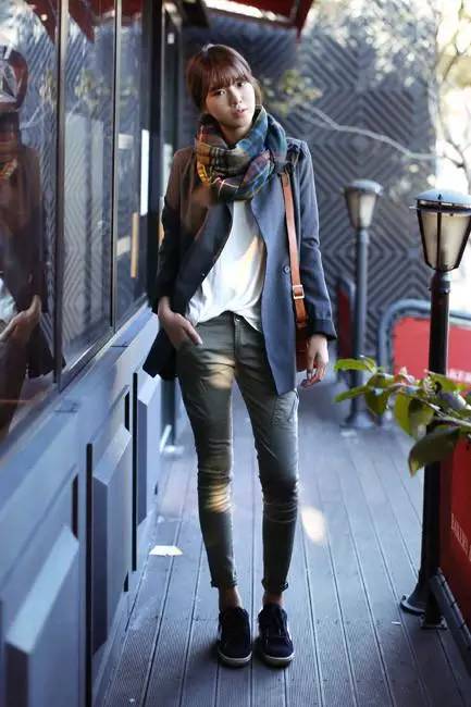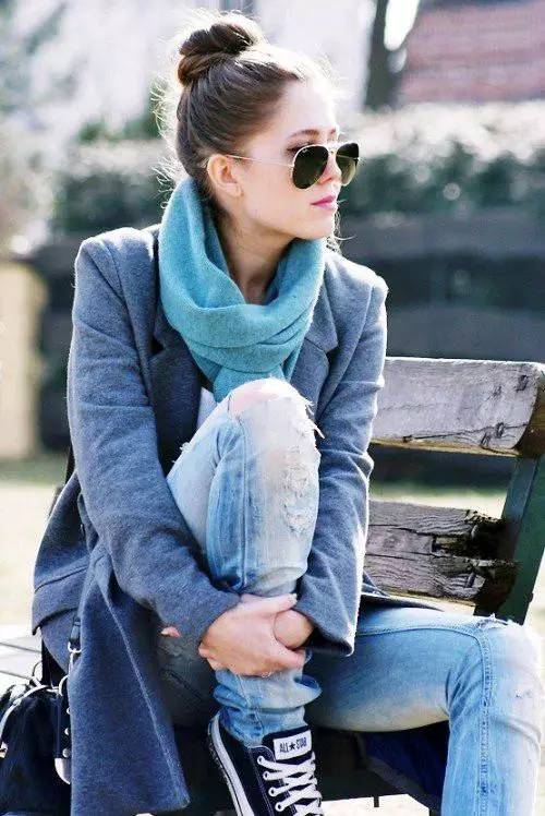 蓝灰色调搭配不好会显得暗沉老气,可以配上一个简单的白T,一个暖色调的包包或围巾或帽子。