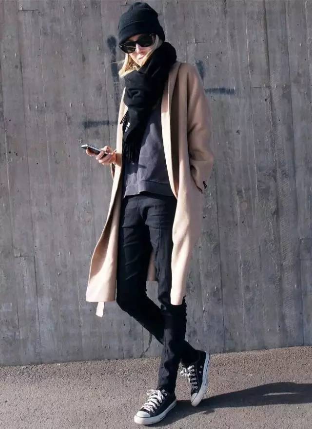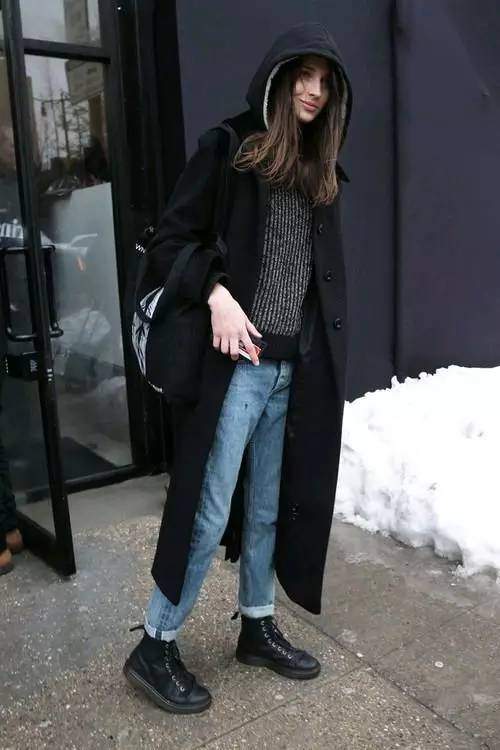 长款带帽黑色大衣,穿上立马变身小巫女,如果没有亮色的包包去搭配,那就换上一条浅蓝色的牛仔裤吧。
