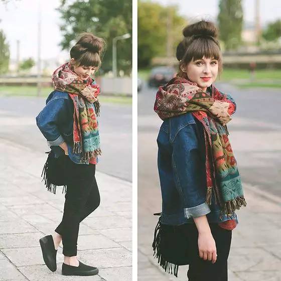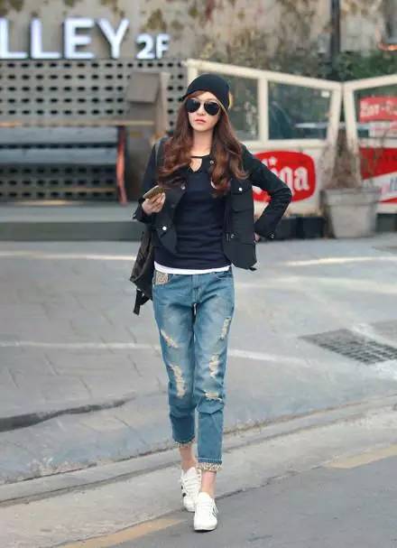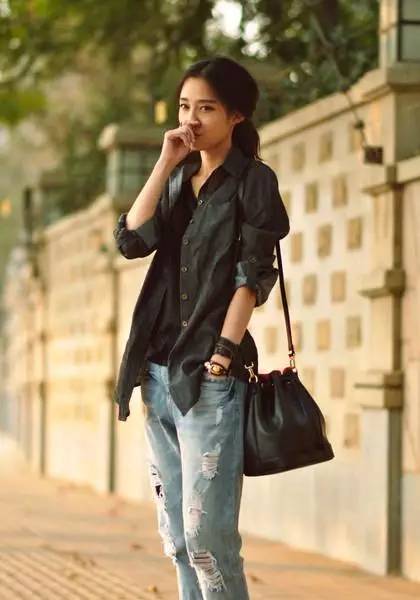 破洞浅色牛仔裤,水桶包包,带有皮质质感的黑色衬衣,欧美范不是只有欧美人才穿的出来。