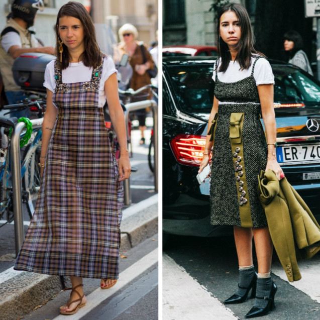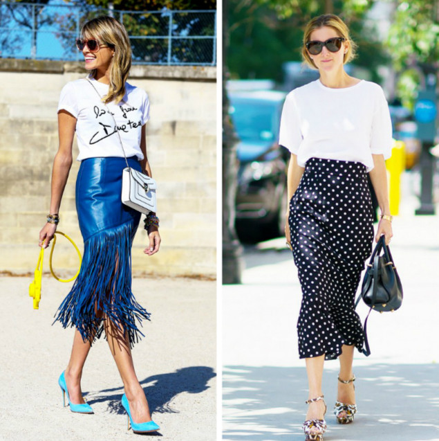 左边的时尚博主Helena Bordon搭配了一条电光蓝的流苏裙,鞋子也是呼应的天蓝色高跟鞋,本来很普通一件白Tee,经过这么一搭配,时髦的不要不要,右边这位好会穿小姐,搭配的复古波点鱼尾裙,豹纹高跟鞋,也很有味道