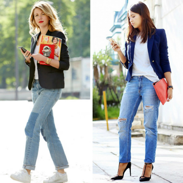 干练的穿法还可以这样,短版西装外套配牛仔裤,左边是ELLE法国版主编Lauren Bastide,她穿的是Isabel Marant的白Tee搭配Max mara的小西装外套,Levi's的牛仔裤,红唇也是让整体Look看起来特别有元气的亮点