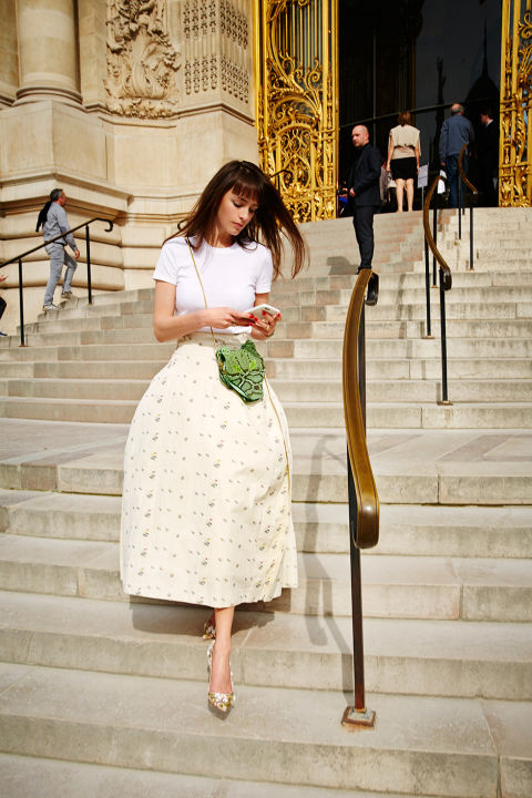现在的趋势是女生的裙子越长越好,这个姑娘用65美金的Petit Bateau白Tee搭配Dior的花苞裙,IMEMOI的虎头包和DSQUARED2的鞋