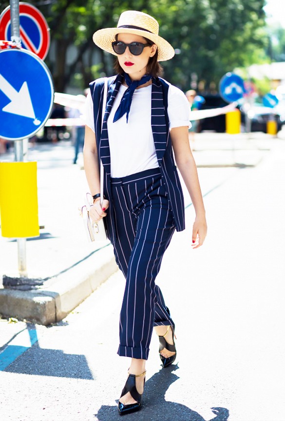 这姑娘搭配思路和上面的差不多,就顺手放到这个类别下面吧,也是从头到脚草帽 黑超 小领巾 黑鞋的组合,背带裤换用ASOS的条纹马甲和裤子套装