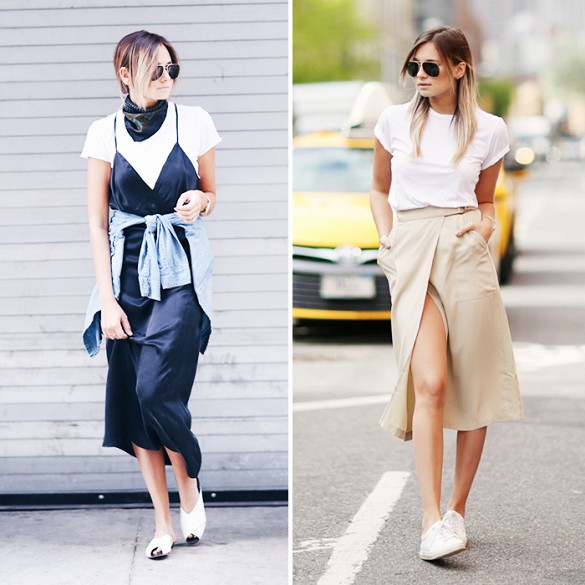 一件衣服穿过两遍,没人看得出的模范生还有纽约时尚博主Danielle Bernstein,一件76美金的ATM Anthony Thomas MelilloTee(这件白Tee海淘网shopbop有在卖:http://t.cn/RynJR8v) 她搭配出了两身Look,而且都加入今年的几个流行元素,小领巾,丝绸睡衣一样材质的连衣裙,中间开衩的裙子