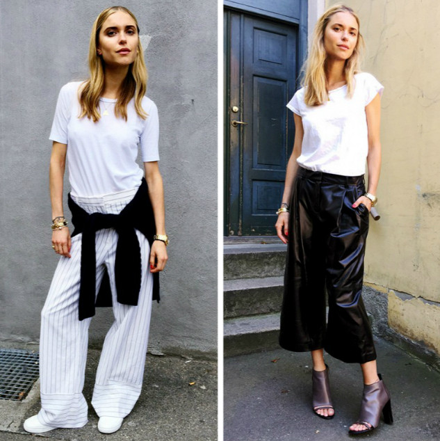 搭配阔腿裤,时尚博主Pernille Teisbaek很有心得,细条纹的裤子不容易穿好看,但是搭配白Tee倒是有一种意想不到的时髦感,Pernille还在腰上系了件深色的毛衫,平衡了有点单调的白色,你也可以试试把毛衫搭在肩膀,钟小姐是这方面的高手