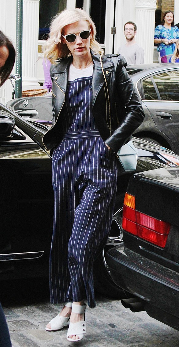 一月姐把刚才说的几个元素都结合了,皮衣、条纹、背带裤,给她点个赞