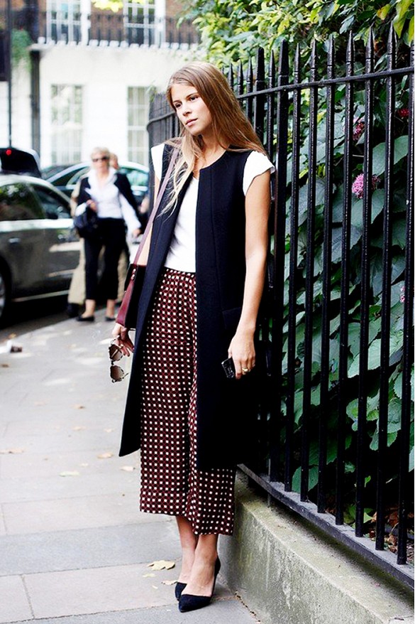 继续阔腿裤的示范,搭配一件长款马甲也是个好主意