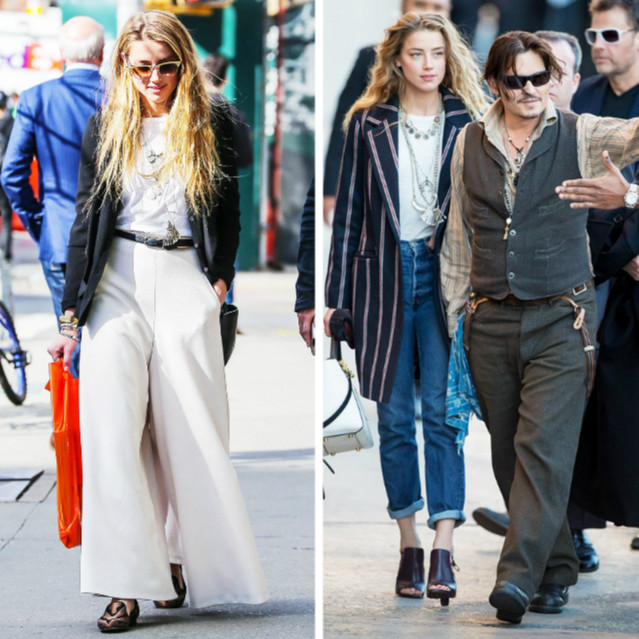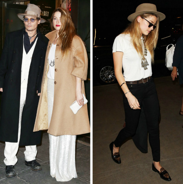 杰克船长的娇妻Amber Heard也喜欢用白Tee凹造型,左边搭配了白色阔腿裤,右边是长款条纹大衣和牛仔裤,都叠戴了长项链做点缀