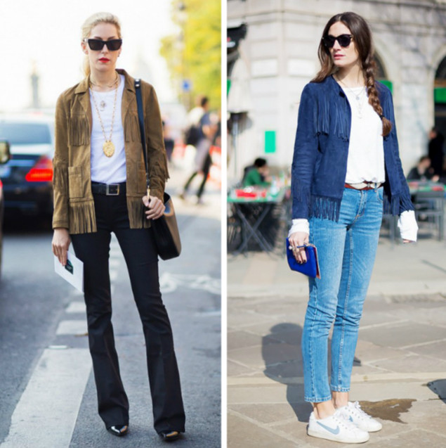 花帮反复说过麂皮 流苏是今年大热的流行元素,所以如果能买一件麂皮流苏外套是再好不过,右边编麻花辫的姑娘,穿的是25美金的Halogen白Tee和1750美金的3.1 Phillip Lim流苏麂皮夹克
