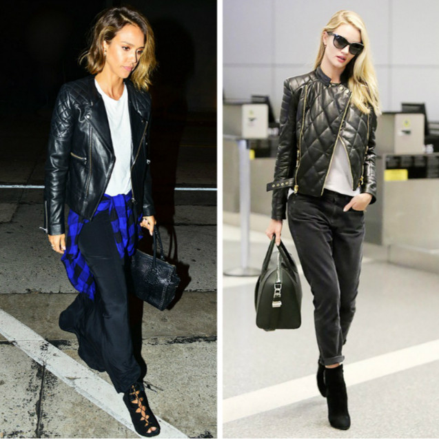 白Tee搭配机车夹克可以参考芭姐和Rosie的穿法,要么像芭姐一样在腰间加上一抹亮色,要么学Rosie除了白Tee,其他一黑到底,姐就这么酷