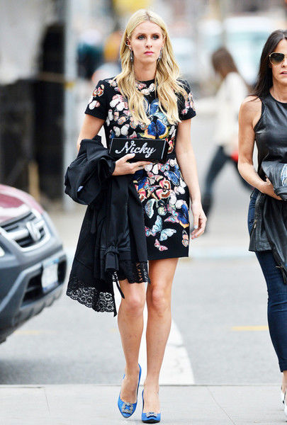 Olivia Palermo很喜欢这双蓝色缎面搭配宝石装饰的Manolo Blahnik,经常穿着它现身各种场合。迷人的宝蓝色在黑白底色的映衬下显得十分抢眼。