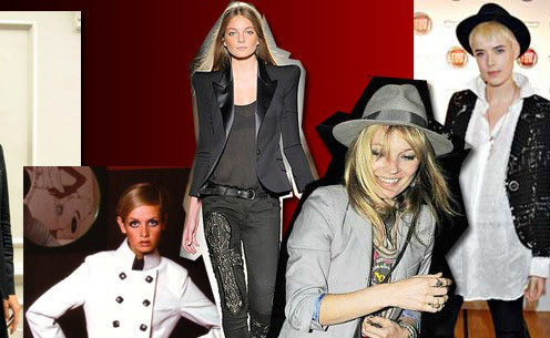 60年代的时尚偶像们,大都带有利落的男孩帅气,追求自我解放的精神映射在时尚上,是各种长裤、西装、领带、背带、短发等造型在纤瘦女孩们身上的重新演绎。此时圣罗兰时装王国建立,他的迷你裙装和经典裤装对时尚中性风功不可没。