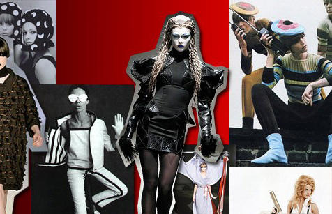经典元素——塑胶、皮质高靴、金属色泽,夸张轮廓,鲜亮色块,钢盔头