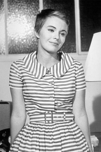 上世纪60年代的短发美人,细节考究,连腰带和扣子也是复古的条纹。