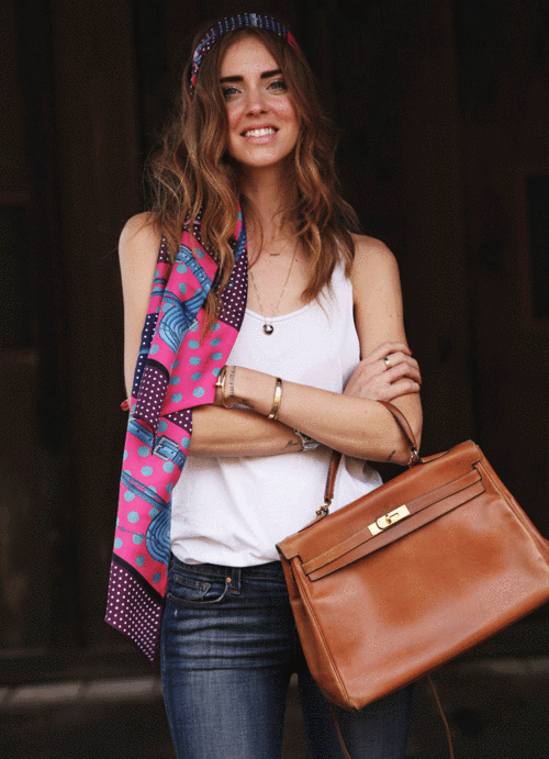 包饰:这个不必多说,早已成为经典的时尚搭配。一条色彩亮丽的丝巾能够让你包包增色不少,焕然一新!