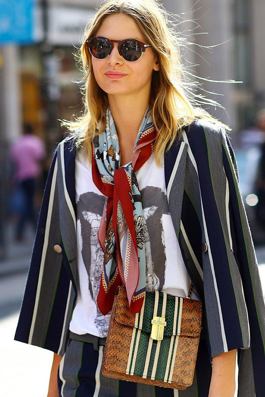 丝巾从来都不安分于只待在脖子上,它可以成为你的头巾、腰带、包饰,只能说发挥创意,丝巾一定会成为你最好的穿搭帮手。