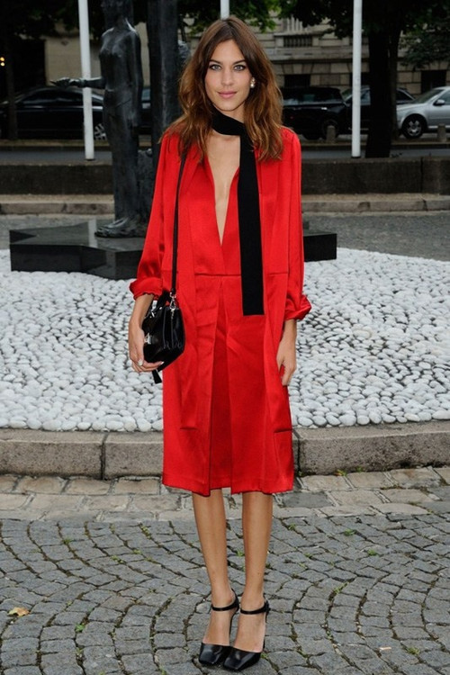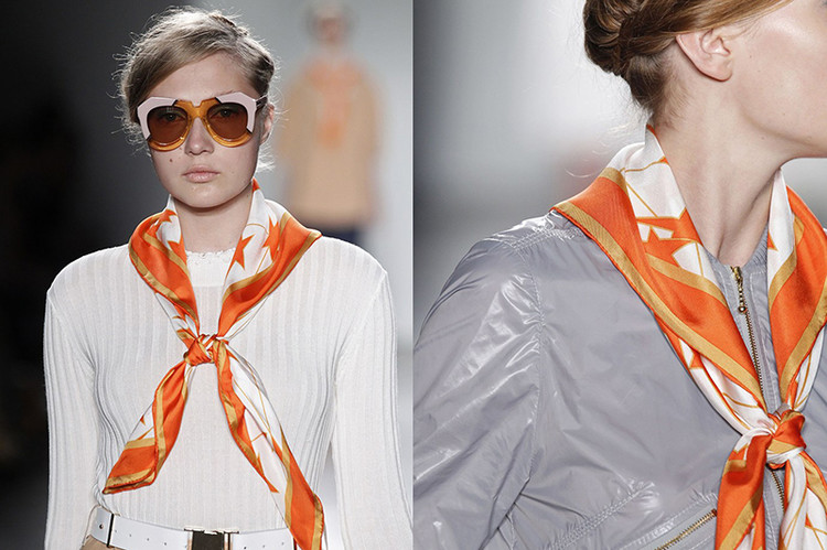 在胸前随意散落:丝巾本身精致讲究的质感与时装碰撞出来的火花,是打造脱俗最佳的时尚单品,衣服颜色素净的时候,还可以里用艳色丝巾提升整身装扮的明亮度。