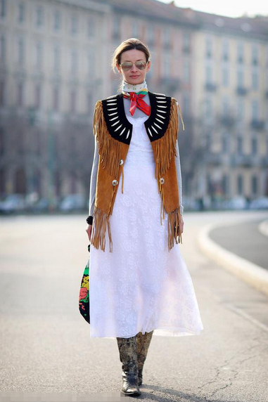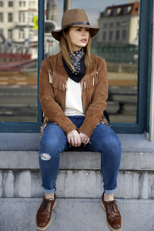 牛仔情结:美式西部的牛仔的方法系方巾,三角形不一定要正正的,歪歪的更有型。