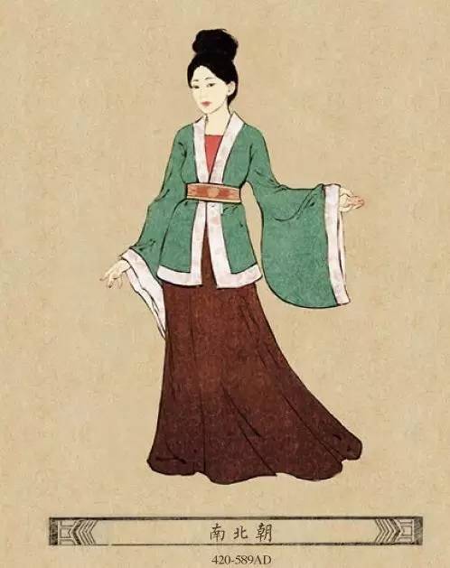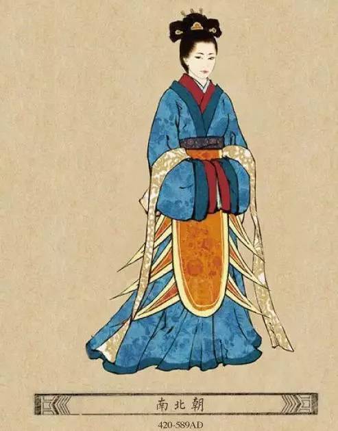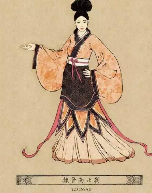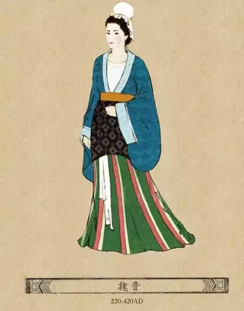 魏晋南北朝是政治和经济动荡的时期,宽衣博带是这时期的流行服饰。男子穿衣敞胸露臂,衣服披肩,追求轻松、自然、随意;女子服饰则长裙拖地,大袖翩翩,饰带层层迭迭,优雅而飘逸。