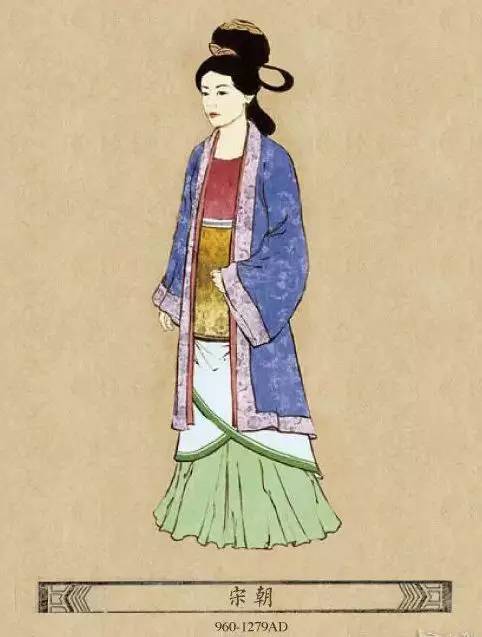 女装有袄、襦、衫、褙子、半臂、下裙、宋裤等服装样式。裤子逐渐开始流行,通常上配抹胸以及一层或多层长褙子。宋代妇女的穿着与汉代妇女相似,都是瘦长、窄袖、交领,下穿各式的长裙,颜色淡雅。襦和袄是基本相似的衣着,形式比较短小,下身配裙子。颜色常以红、紫为主,黄次之。