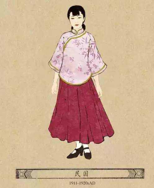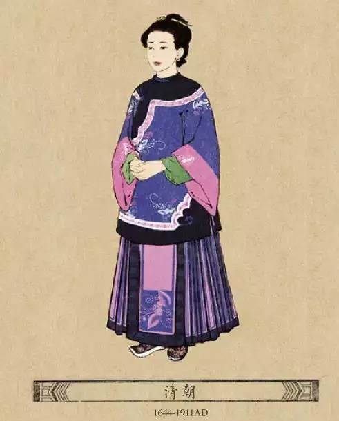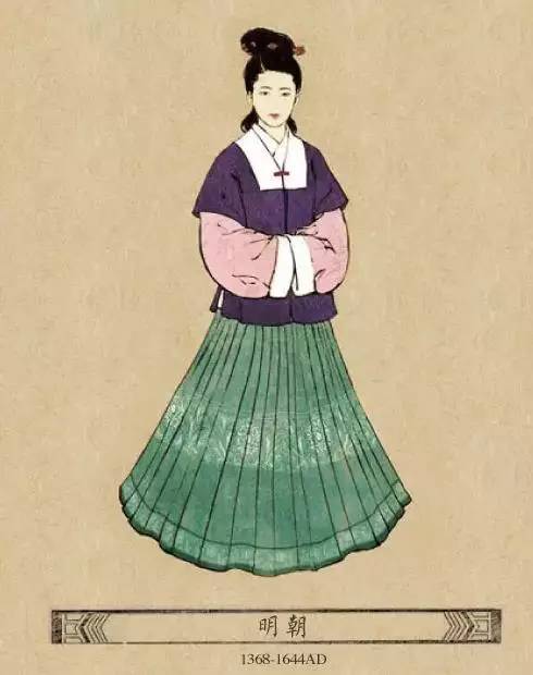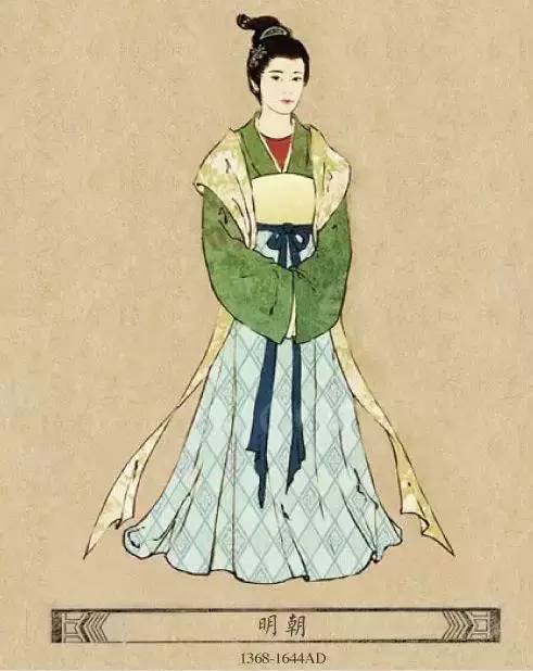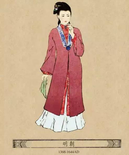 明代女装上衣是三领窄袖,身长三尺,露裙二、三寸。当时扬州流行一种新式样:女衫长二尺八寸,袖子宽一尺二寸,外护袖镶锦绣,冬季镶貂狐皮。裙装在明代初年用色偏向浅淡。裙褶十分盛行,有细密褶纹,也有大褶纹。