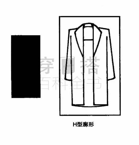 H型也叫箱型、矩型。其特点是平肩、不收紧腰部、直筒型下摆。其特点是修长、简约、宽松、舒适;具有严谨、庄重的男性化风格特征