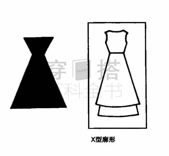 X型廓型是最能体现女性优雅气质的造型,具有柔和、优美的女性化风格。上衣和大衣以宽肩、阔摆、收腰为基本特征;裙子和裤子也以上下肥大、中间瘦紧为特征