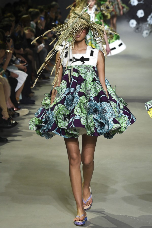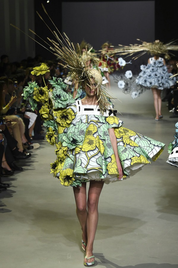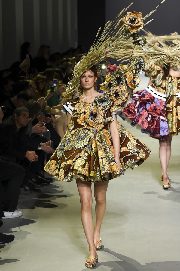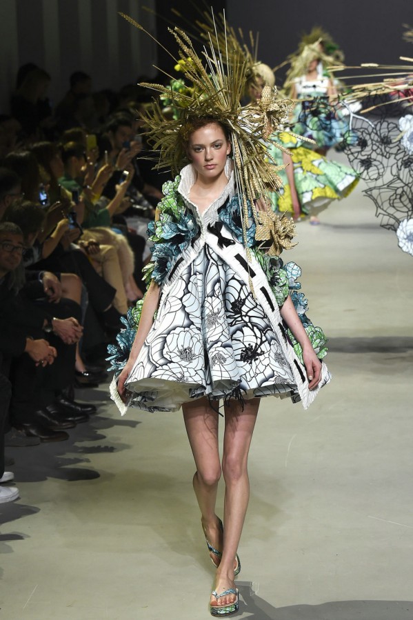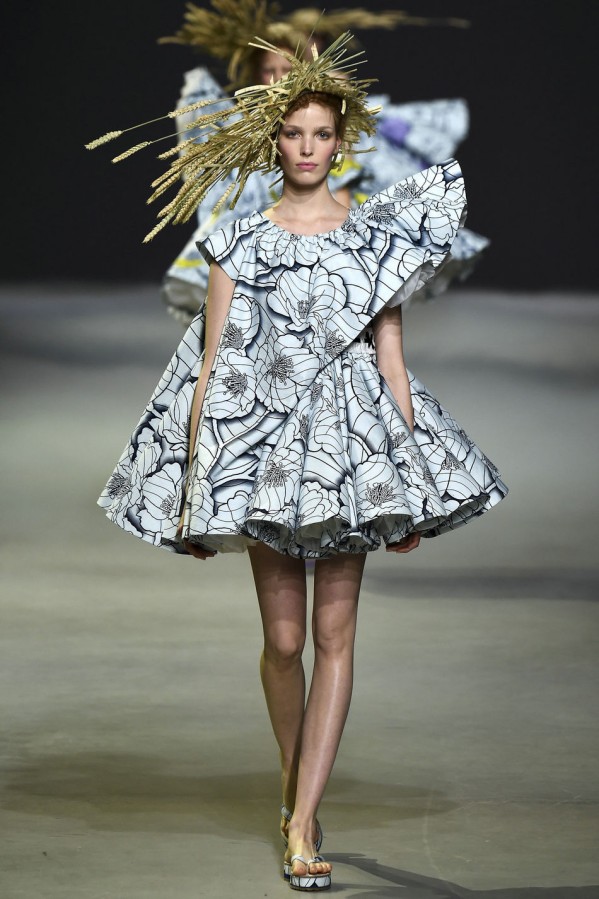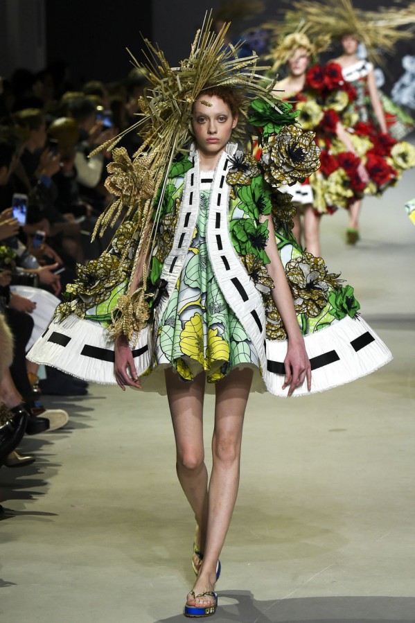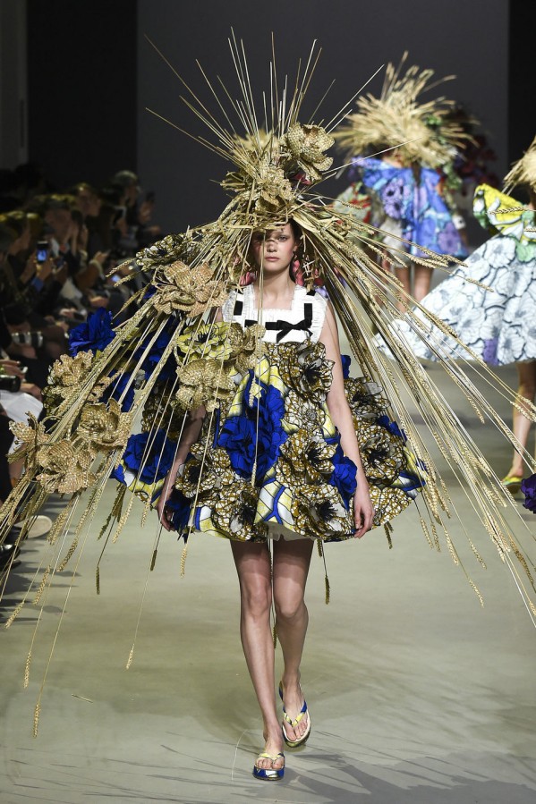 这两位设计师和Vlisco公司联手合作。这家荷兰公司的历史可以追溯到1846年,专门生产batik风蜡染及木刻布料,在西非和中非十分受欢迎。开场的款式是一件A字连衣裙,由夸张的真丝欧根纱衬裙撑起,看上去就像一本彩色画册——勾出了墨蓝色的轮廓,但还未填充颜色。此种基调定下来后,后续的每一个超现实主义创意都化身为空间和色彩的幻象:丛丛簇簇带着多节花蕊的立体花朵图样浮于布面之上,而另一些花朵则完全脱离裙身,不断向上延伸直至碰触到头饰。甚至连靛青色的轮廓线都被打造出三维效果,像刺绣品一样在褶边上向外荡着。从始至终,在碳纤维的加固作用下,稻草束恣意伸展,占满了整个T台,模特们彼此擦身而过时,不得不扭转腰肢来避开彼此,如同翩翩起舞一般,好一个疯狂的时刻。