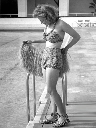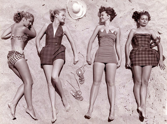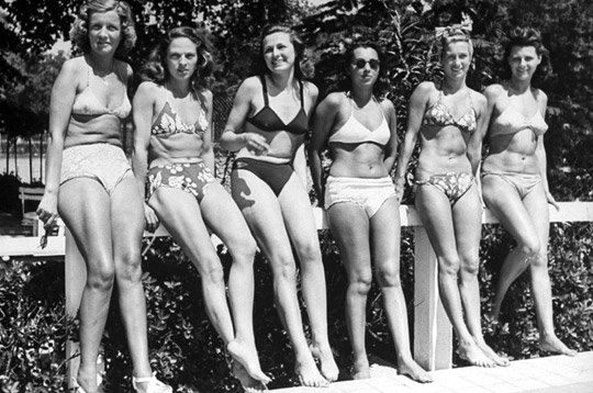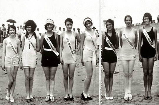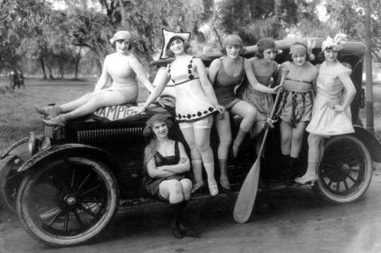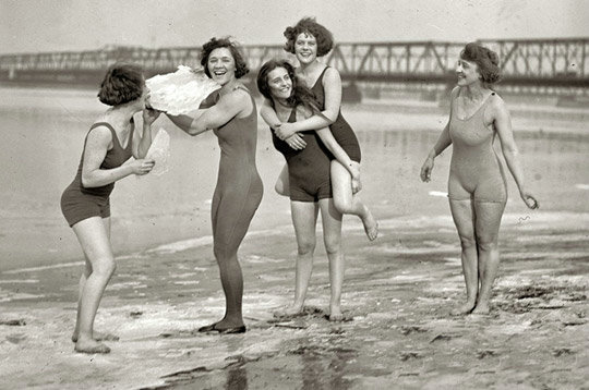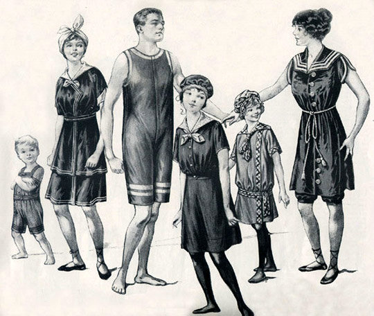 1903年法国,人们在海滩上嬉戏,那时很多人就穿着日常的衣服下海,并不专门准备泳衣。