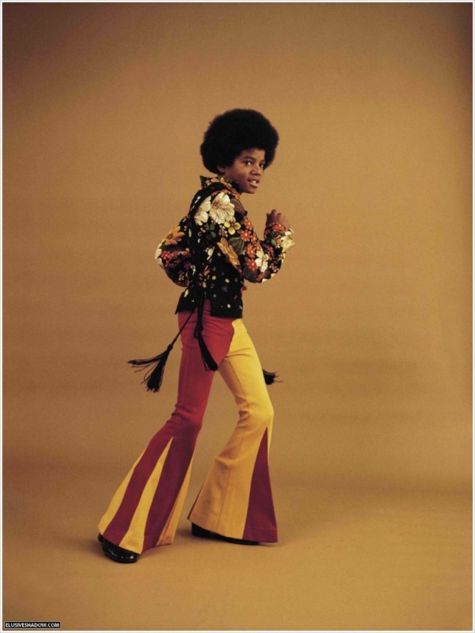 1971年的Michael Jackson。他所处的已经是一个混合多变的多元化的时代。在当时的摇滚巨星猫王的穿衣风格的带动下。仅有13岁的MJ身上,就已经很有70年代风格的时装造型显现:花衬衫和喇叭裤。这样的打扮自然也是深受当时猫王的影响。