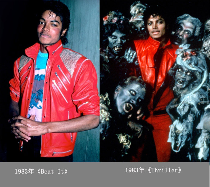 1983年,Michael Jackson在《Beat It》的MV中穿着的红色机车皮衣在当时迅速被时尚圈所追崇。在同年的《Thriller》的MV中也有穿着类似的红色皮衣。这两件红色皮衣至今仍被许多人所津津乐道。《Beat It》那件皮衣更是被拍出了高价。