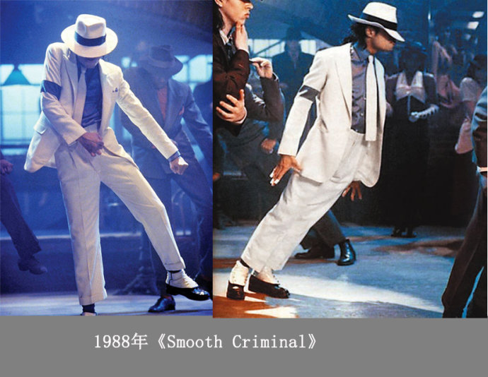 1988年,Michael Jackson的经典造型之一:在MV《Smooth Criminal》中穿着一身白色套装,带着白色宽檐帽,以及他还在这支MV中展现出了绝对45度前倾的完美姿势。——后者更是申请了专利。