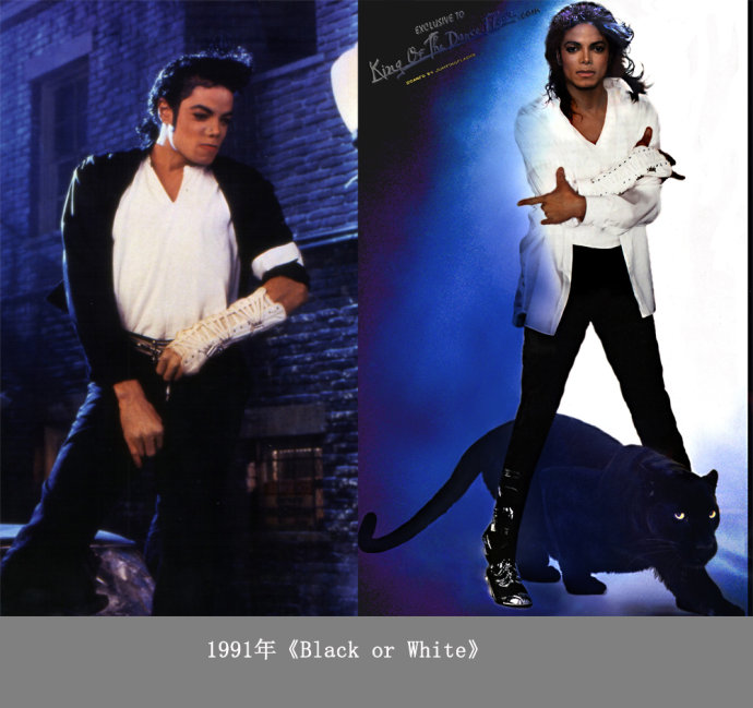 1991年,Michael Jackson在MV《Black or White》的造型,分别是黑色外套同白色外套两个造型。唯一不变的是他戴在单手上的白色护臂套,牛皮制成,且以捆绑式样示人。