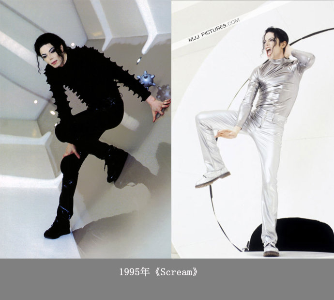 1995年,Michael Jackson在充满太空风格的MV《Scream》的两个造型。分别是一身的银白色光面布料制成的套装和如同外太空生物凸起颗粒的黑色套装造型,充满了未来主义的风格。